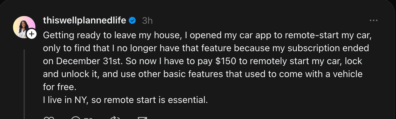 At this point, I’m surprised there isn’t a tiered Life™ subscription. One flat rate for housing, entertainment, groceries, and the right to exist without pop-ups. I’d say I shouldn’t give them ideas, but there’s already a Black Mirror episode poking at this.